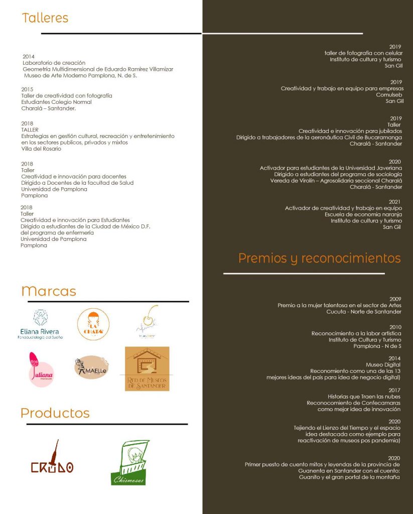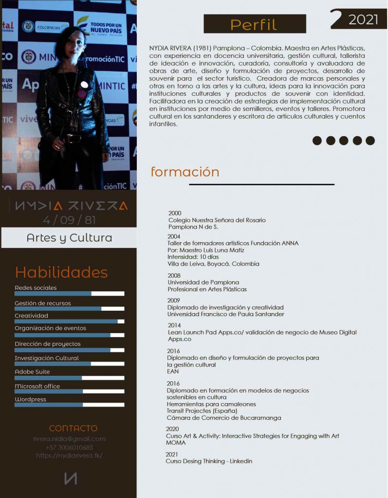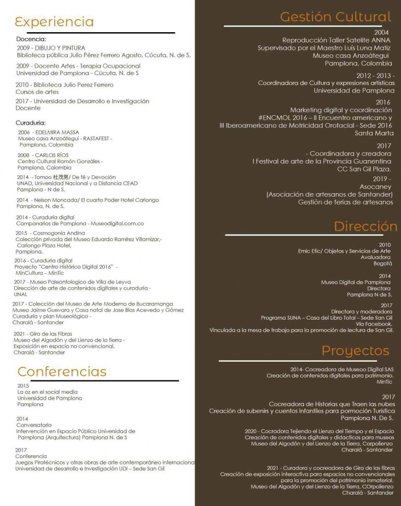 …Estudié en Pamplona Norte de Santander. Luego continué especializándome en emprendimiento, innovación y creatividad. También en formulación de proyectos y otros cursos de educación para museos. Y aprendiendo cada día de mis clientes.